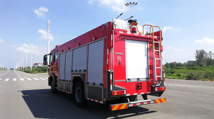 豪沃6.1噸水罐消防車采用中國重汽集團濟南卡車股份有限公司生產的ZZ1187K501GF1底盤改裝而成。整車由消防員乘員室和車身兩大部分組成,乘員室為單排改雙排,可乘坐2+4人,該車為內藏罐結構,車身兩側為器材箱,中部為罐體,后部為泵房。載液罐體為優質碳鋼,內部噴涂環氧底漆及環氧瀝青漆,與底盤采用彈性連接,載水量6100kg,裝備了上海茸申消防設備有限公司生產CB10/40型消防泵,額定流量40L/S,車頂安裝成都威斯特消防機械有限公司生產的PS8/40W型車用消防炮。該車最大的特點是載液量大、操控性好、維修簡便。可廣泛應用于公安消防隊、廠礦企業及社區、碼頭等場所,撲救大型油類火災和一般物質火災。 | |||