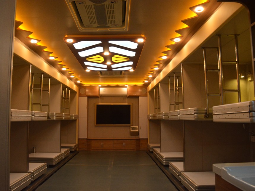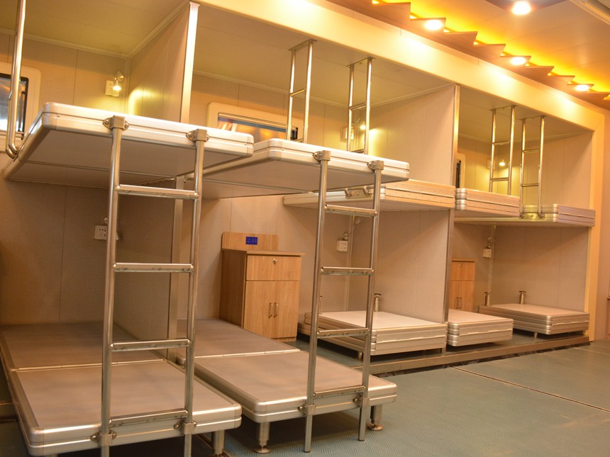專用功能:室內住宿設備為12組高低床,可提供24人舒適宿營;配備有冷暖空氣調節系統、電視影音系統、照明系統、儲物柜、床頭燈及開關插座等必要生活設施;獨立衛生間配備有盥洗臺、LED背光整容鏡、強制通風換氣裝置、雙層外推窗、節水型不銹鋼便池等設施;發電機功率5KW,額定電壓220V,供電時長約6-10小時。 | |||