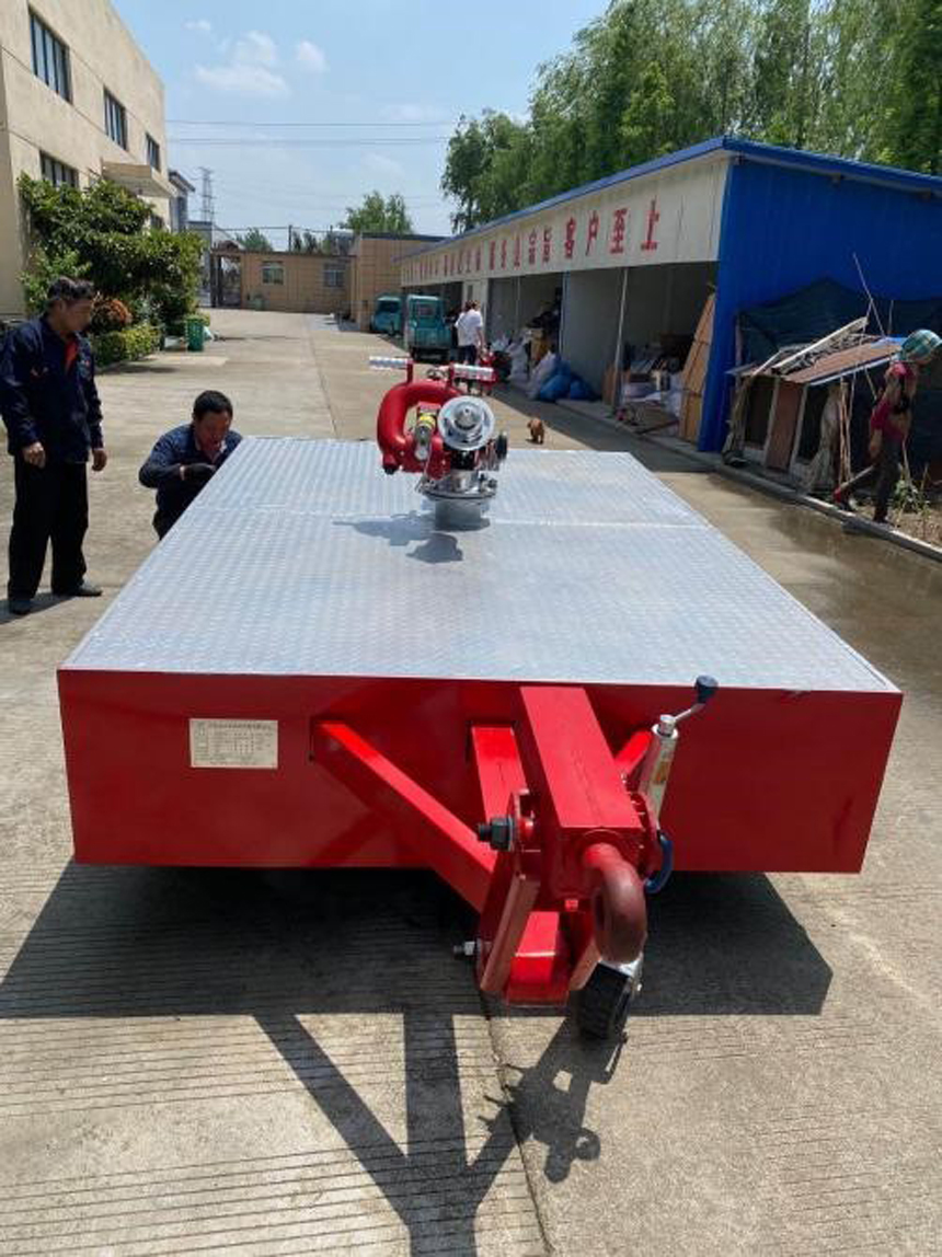 17、拖車規格:碳鋼材質,配備單軸拖車防滑平臺、拖車底盤配備注水穩壓艙,提供了的工作平臺。炮頭壓力達16公斤以上時仍然穩固不傾覆。四點平臺支腿和舌形拖車鉤。最大安全拖帶行駛速度100公里/小時;